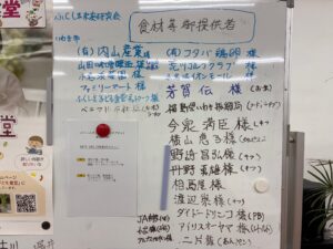 食材は、地元企業・農家・店舗の皆さまからの寄付によって支えられており、当日も多くの提供者名がボードに掲示されていました。